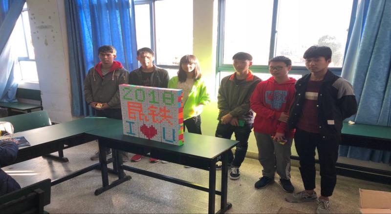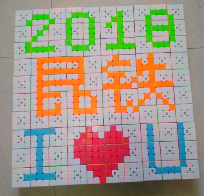 图为社团成员完成100个魔方拼图,用做社团活动标语。