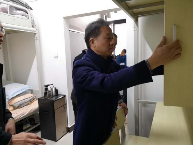 在检查学生公寓时,张志宏书记仔细查阅公寓管理台账,对台账对应性和可操作性提出了改进意见,并实地查看了公寓内部设施设备、消防疏散通道,与公寓管理人员和学生亲切交谈,询问学生管理情况和学生的生活情况,嘱咐学生一定要注意返家途中及假期的安全。