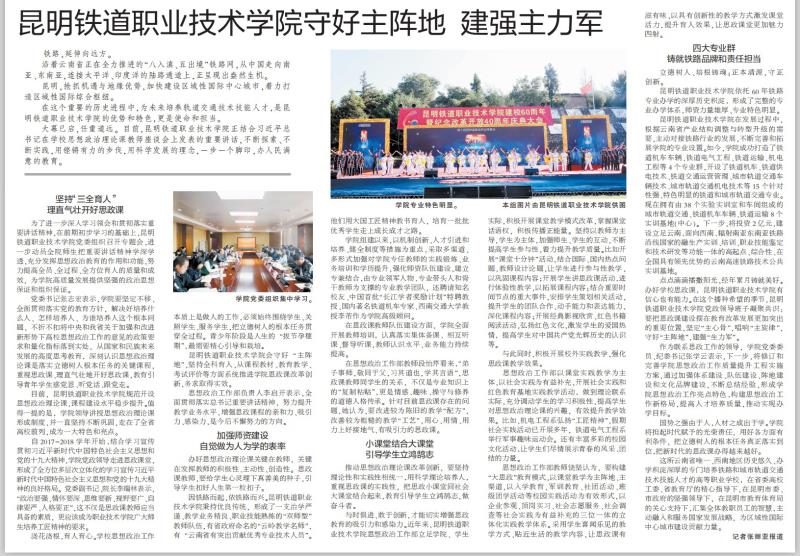 2019年4月2日,《昆明日报》专题报道学院思想政治工作题为《昆明铁道职业技术学院守好主阵地 建强主力军》的文章,文章指出昆明铁道职业技术学院正结合习近平总书记在学校思想政治理论课教师座谈会上发表的重要讲话,不断探索、不断实践,用铿锵有力的步伐,用科学发展的理念,一步一个脚印,办人民满意的教育。专题报道从坚持“三全育人”,理直气壮开好思政课;加强师资建设,自觉做为人为学的表率;小课堂结合大课堂,引导学生立鸿鹄志;四大专业群,铸就铁路品牌和责任担当共四个板块就学院思想政治教育工作作了详细阐述。