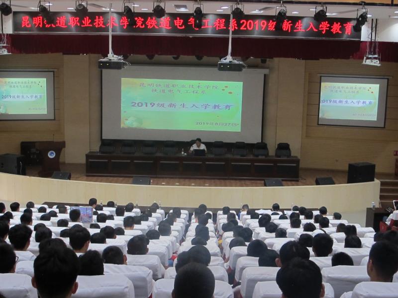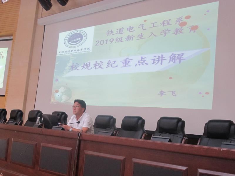踏着习习秋风,2019级新同学带着青春的活力,带着对大学生活的无限憧憬,迈进了昆明铁道职业技术学院铁道电气工程系这个温暖的“大家庭”。为了让新同学更快熟悉新环境、顺利适应大学新生活,电气工程系于8月27日下午在睿智楼报告厅举行了新生入学教育讲座。本次讲座的主题是“学习校纪校规,树立安全意识”,由辅导员李飞老师主讲,系主任邓正均老师,书记刘影老师,教学秘书、辅导员、班主任及2019级全体同学参加。