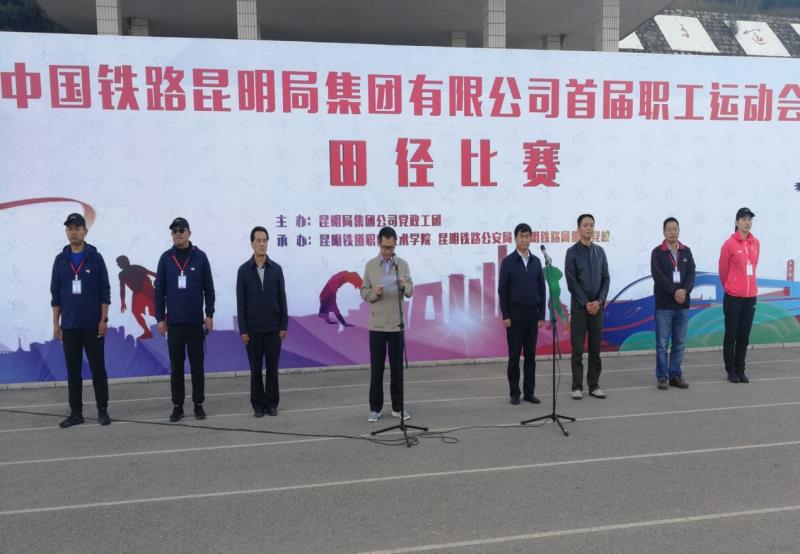 2019年10月26日上午8:30,中国铁路昆明局集团公司首届职工运动田径比赛在昆明铁道职业技术学院运动场隆重开幕,昆明局集团公司工会主席李洪明、副主席沈冬林、主任张余、昆明铁道职业技术学院党委副书记张学云、工会副主席曾志民、昆明铁路公安局工会主席常群等参加了开幕式。开幕式由集团公司工会副主席沈冬林主持。李洪明主席宣布“昆明局集团公司首届职工运动会田径比赛开幕”,全场响起热烈的掌声。