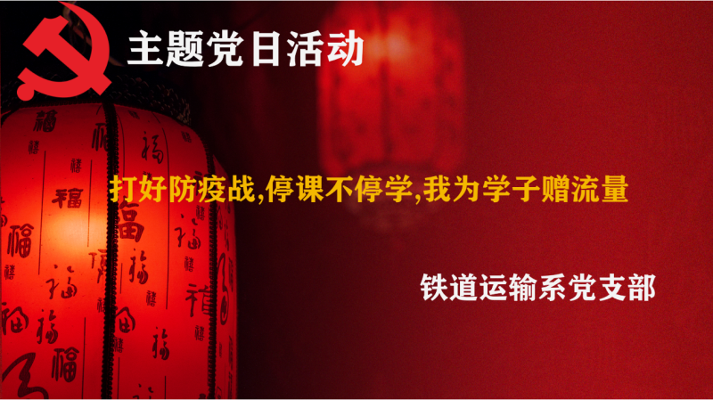 为解决学生实际存在的困难,用行动践行向雷锋同志学习,2020年3月9日,铁道运输系党支部开展“??尾煌Q?,我为学生赠流量”主题党日活动。此次主题教育活动得到了广大党员同志的积极响应,大家通过各种各样的方式为学生转赠流量,表达我们的爱心!学院党委知悉情况后,非常关心困难学生的网课情况,党支部第一时间就收到了学院党委的慰问,并要求支部一定要把此次活动搞好,切实解决这部分学生网课期间流量的后顾之忧,让学生安心的进行每天的网络课程直播学习。
