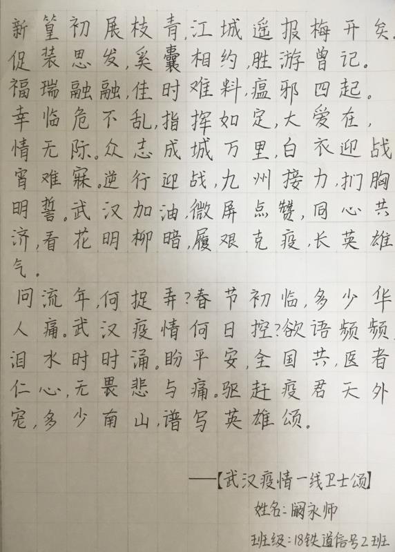 突如其来的疫情,成为我们这个冬天、这个寒假一份特殊的经历,改变了生活的规律与节奏,却也带给我们不同寻常的体验。疫情当前,爱不隔离。在这场没有硝烟的战争中,昆铁学子众志成城,抓住特殊时期的特殊体验,结合疫情防控,创作抗“疫”文艺作品,传递温暖、力量与信心!
