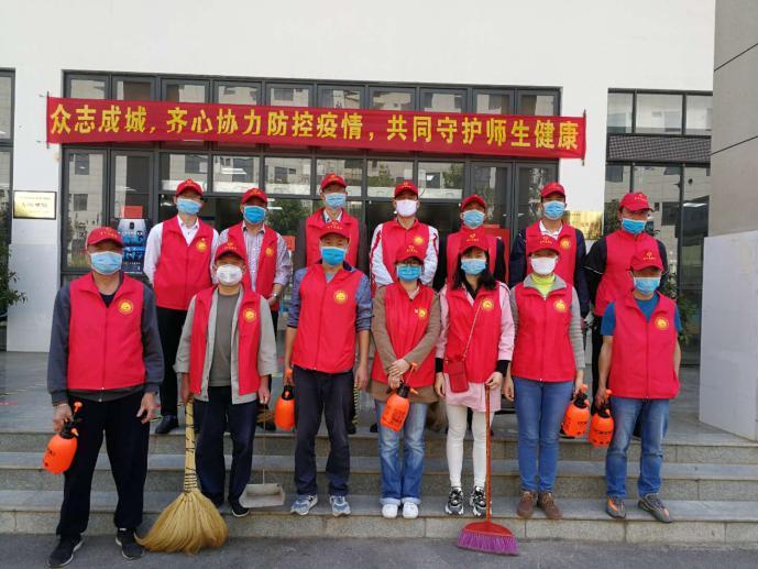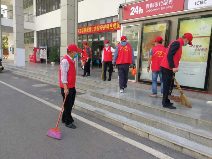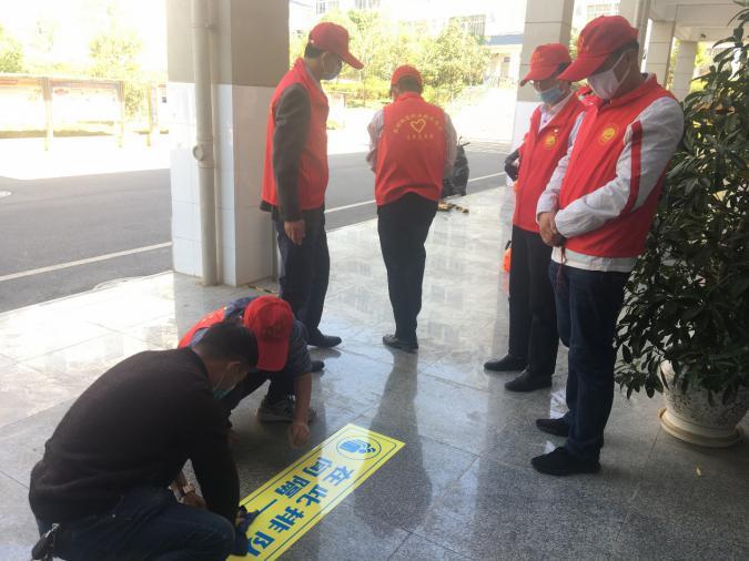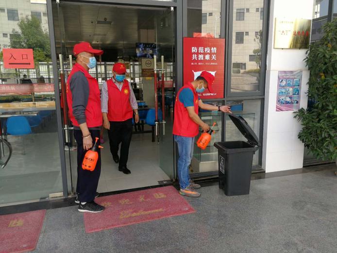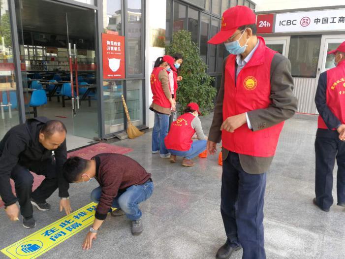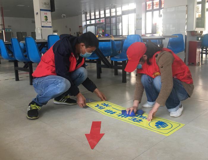 行政第五党支部党员以“食堂大厅”为中心、食堂外围为辐射开展环境卫生打扫、物品清理消毒、安全隐患排查及就餐导流标识的张贴等工作。