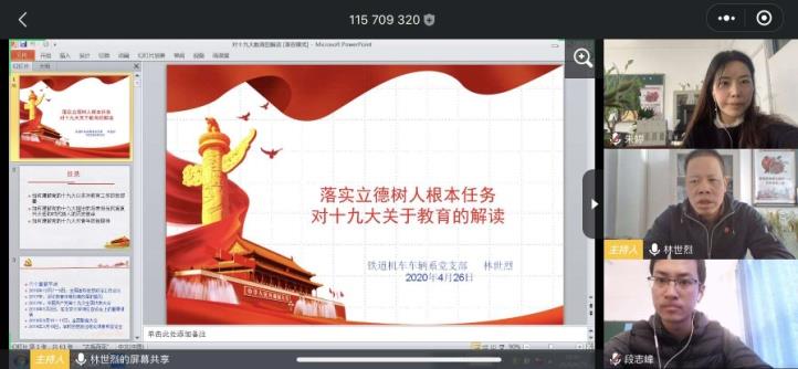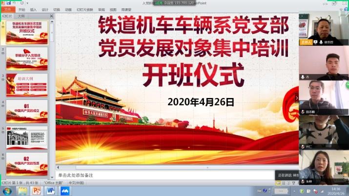 “停课不停学”,党员的学习和发展工作更加需要持续推进。铁道机车车辆系党支部于2020年4月26日开始举行了为期2天的党员发展对象集中培训,培训由党支部书记林世烈同志、党支部组织委员黄瑜同志主讲,支部党员朱婷同志也积极参与,参加培训的学员由段志峰、陈文杰和李开美,此次党员发展对象集中培训通过腾讯会议网络直播的形式进行。