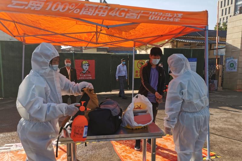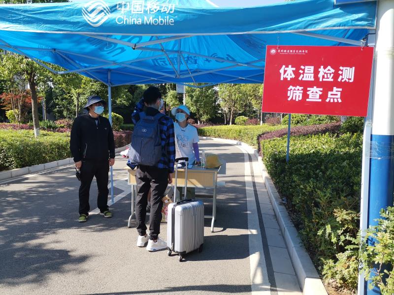 通过对随身行李箱进行消毒,扫描抗疫码、出示健康码、测量体温、登记等入校流程后进入校园,并向班主任上交相关表格进行报道。