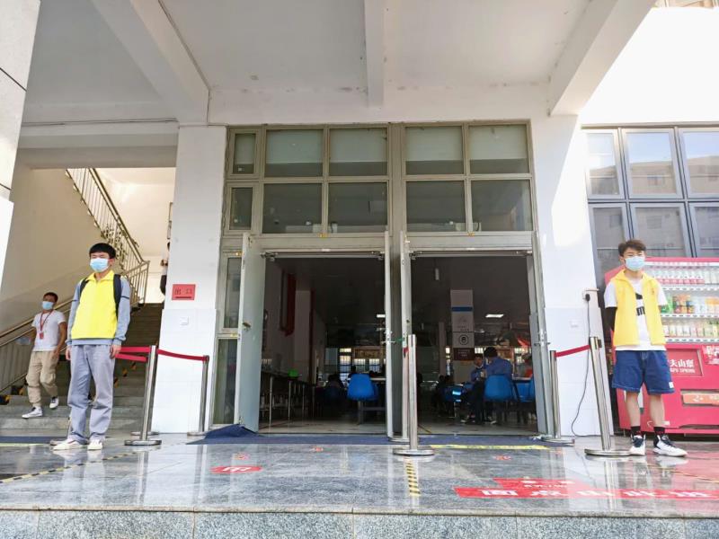 志愿者们引导同学们按照路上贴的路标正确出入食堂;引导同学们按照餐桌上贴的对角正确入座;监督同学们不聚众,不拥挤。