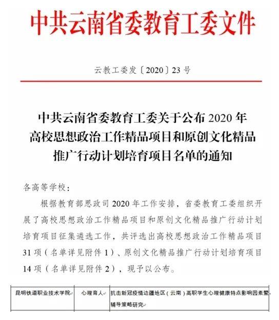 近日,云南省高校思想政治工作精品项目评选揭晓,昆明铁道职业技术学院马克思主义学院申报的心理育人项目——《抗击新冠疫情边疆地区(云南)高职学生心理健康特点影响因素及辅导策略研究》被评选为2020年云南省高校思想政治工作精品项目。