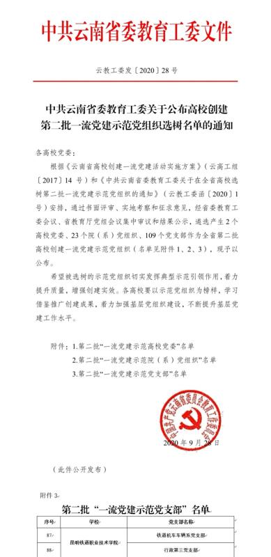 祝贺学院铁道机车车辆系党支部、行政第三党支部成功创建云南省高?!耙涣鞯辰ㄊ痉兜持Р俊?。