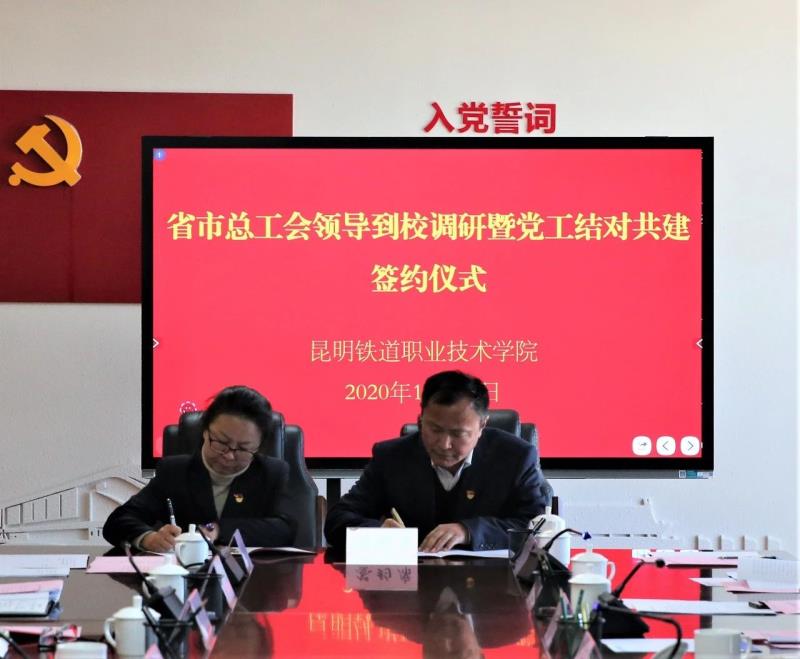 11月18日,昆明铁道职业技术学院行政第二党支部与市总工会机关党支部“党工结对共建协议”签约仪式在学院举行。省总工会党组书记、常务副主席孔贵华,市人大常委会副主任、市总工会党组书记、主席戚永宏出席并见证签约。