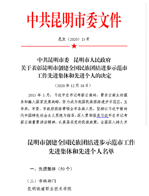 近日,中共昆明市委、昆明市人民政府发布《关于表彰昆明市创建全国民族团结进步示范市工作先进集体和先进个人的决定》,公布了昆明市创建全国民族团结进步示范市工作先进集体和先进个人名单,我院荣获昆明市创建全国民族团结进步示范市工作先进集体。