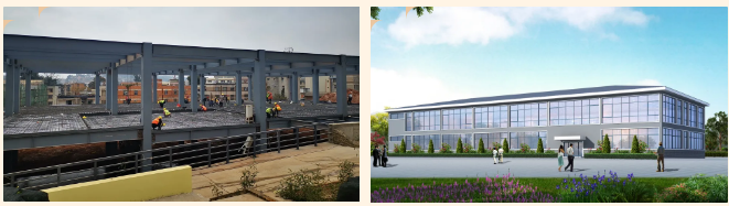 组图1 完成钢结构主体的高铁车站和建成后的效果图