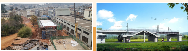 高铁车站钢结构主体已基本完成;桥梁的三座桥墩已完成,钢箱梁已浇筑并进入保养期,钢梁将于月底运达并进行吊装;隧道主体已完成建设;检修车库基础已基本完成,一号股道基础开始浇筑。为确保设备到位后的安装或安置,各基础设施也正在加快推进后续建设。
