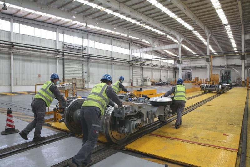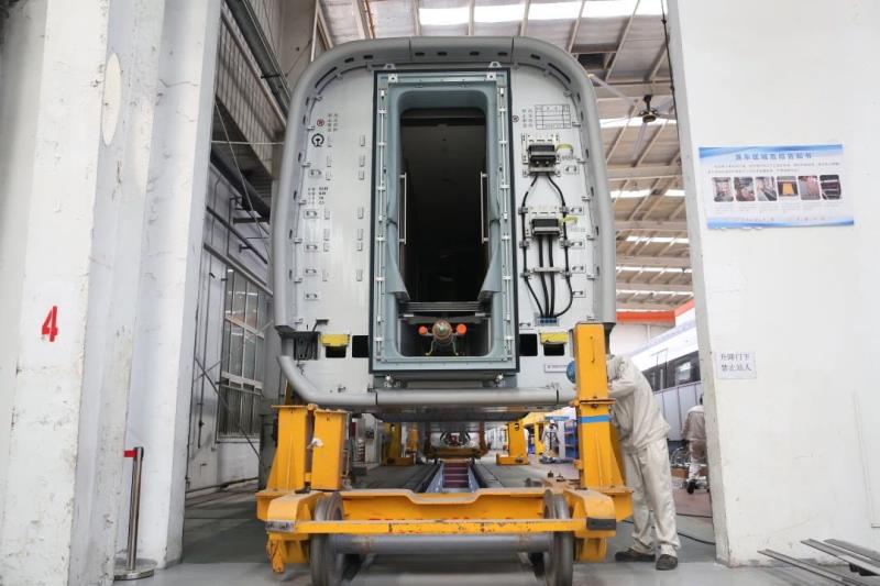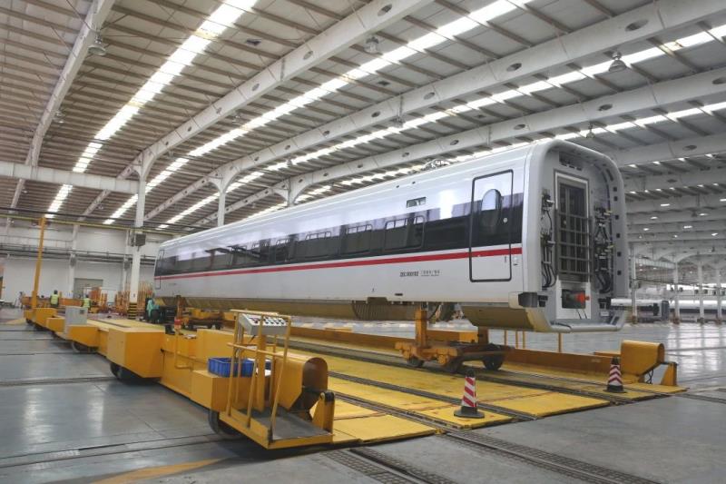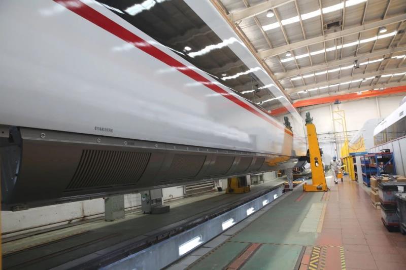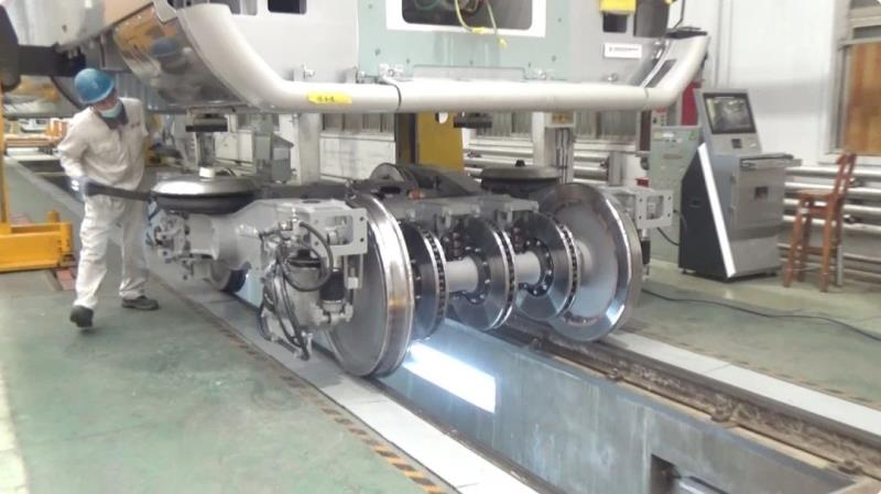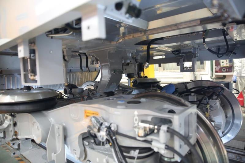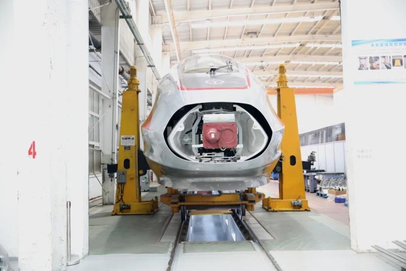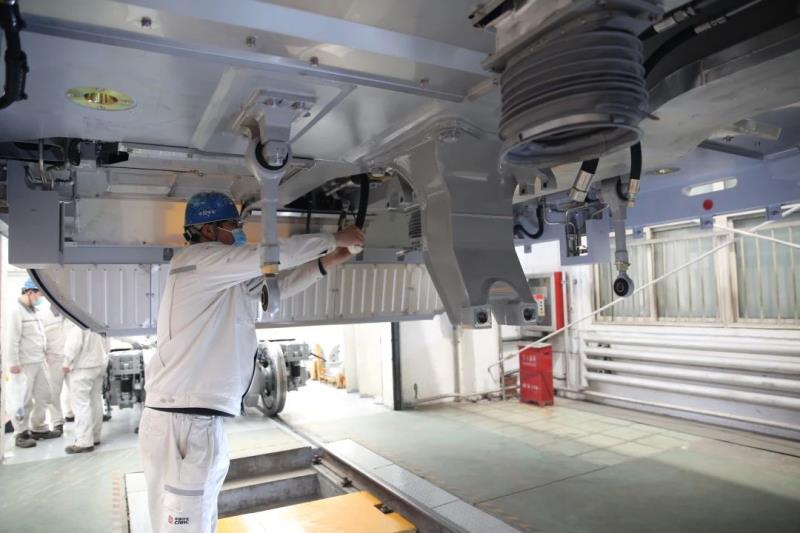 继3月11日完成竣工交付仪式后,为做好高速动车组进行公路运输的准备工作,12日,我院两台动车组运到公司总装分厂,开始进行车体与转向架的分离及受电弓的拆卸。