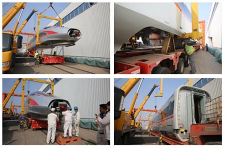 在中车青岛四方股份有限公司的技术人员的周密配合下,首先完成了动车组车体的吊装工作。技术人员通过指挥两台50吨的吊机,利用动车组的专用吊具,将车体稳稳地吊装到拖车上,随后用固定链条、手动紧固杆等进行车体位置、车钩内部的位置固定,以确保运输过程中的安全。