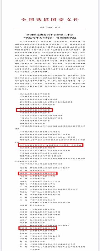 近日,全国铁道团委印发关于表彰第二十届“铁路青年五四奖章”等荣誉的决定,我校团委荣获“全国铁路五四红旗团委”荣誉称号,19高速铁路工程一班荣获“全国铁路五四红旗团支部”称号,杨品雪老师荣获“全国铁路优秀共青团干部”称号,19城市轨道交通机电技术2班李婵娟同学荣获“全国铁路优秀共青团员”荣誉称号。