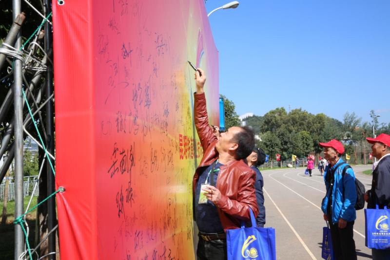 足球场上老校友们正踮起脚尖在空白区域签名,巨大的签名墙上,留下了全国各地各界校友的名字。