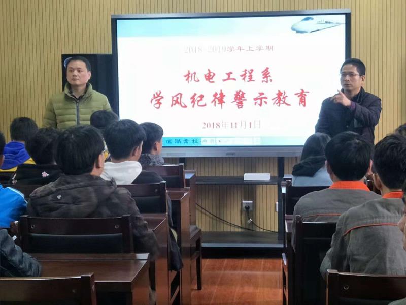 教育部今年9月印发了《关于狠抓新时代全国高等学校本科教育工作会议精神落实的通知》,对加强本科教育再次“加码”?!锻ㄖ芬笱细癖究平逃萄Ч坦芾恚蕴八巍?,加大过程考核成绩在课程总成绩中的比重,严把毕业出口关,坚决取消“清考”制度,近期不少高职院校也对学习成绩挂科较多学生进行清退。为了进一步严肃校规校纪、树立优良学风,营造良好的学习氛围,机电工程系于111日开展了学风纪律警示教育。系书记张永明老师主持本次教育活动,系主任许剑伟老师、辅导员李洁老师参加了本次教育活动。