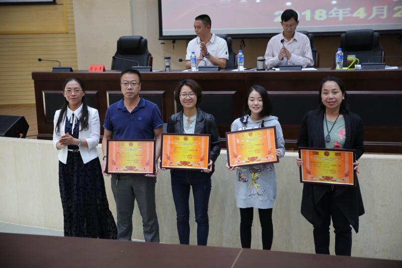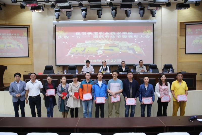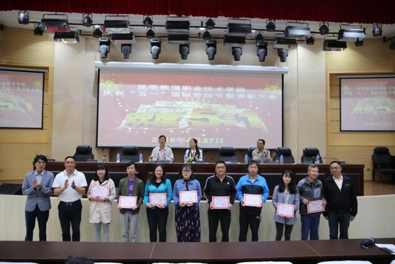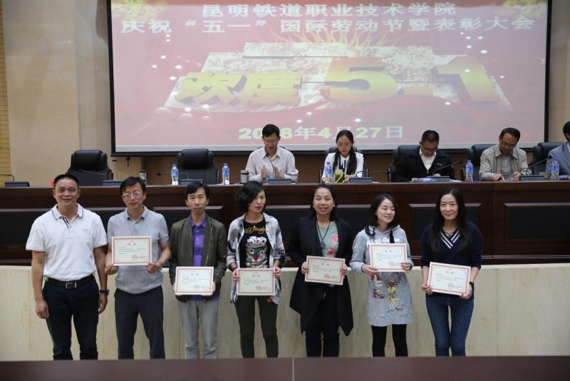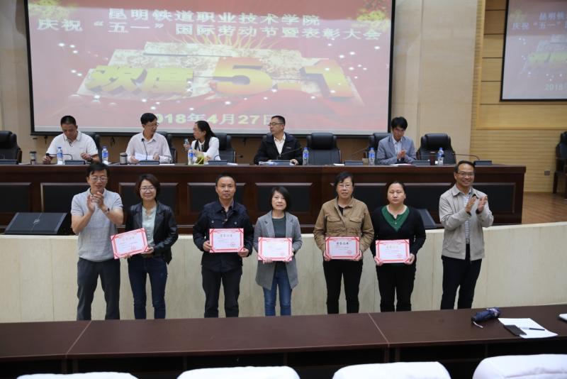 在昆明铁道职业技术学院庆?!拔逡弧惫世投隰弑碚么蠡嵘?,谢文副院长宣读了昆明铁道职业技术学院工会委员会“关于表彰2017年“先进职工小家”、“工会积极分子”、“优秀工会干部”、“先进女职工”、“五好文明家庭”的决定”,院、校领导向受表彰的机电工程系工会小家、铁道电气工程系工会小家、保卫计财工会小家、铁道运输工会小家等4个“先进职工小家”代表,金彦彤、董志伟;冯涛、谢丽两户“五好文明家庭”代表,以及“工会积极分子”、“优秀工会干部”、“先进女职工”等30位先进个人颁奖。同时,张书记还向我院参加昆明市第七届“聆听.春之声”教职工舞台剧大赛并获奖的教师团队颁奖。