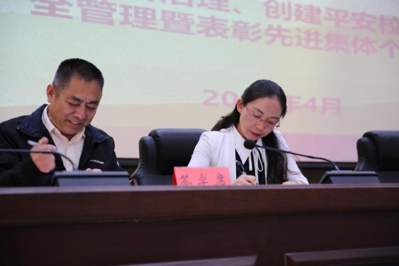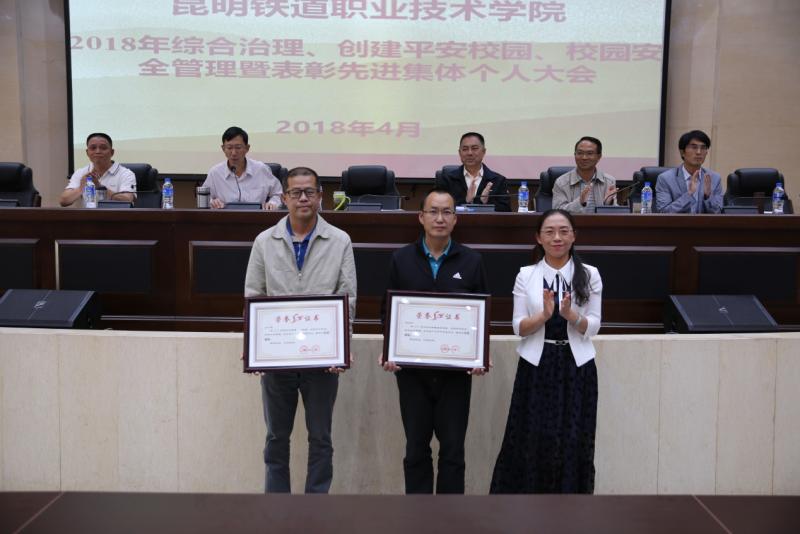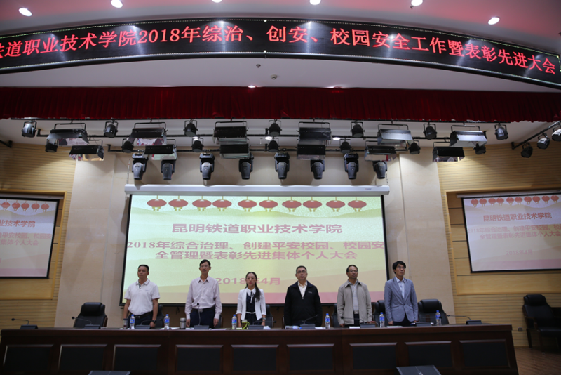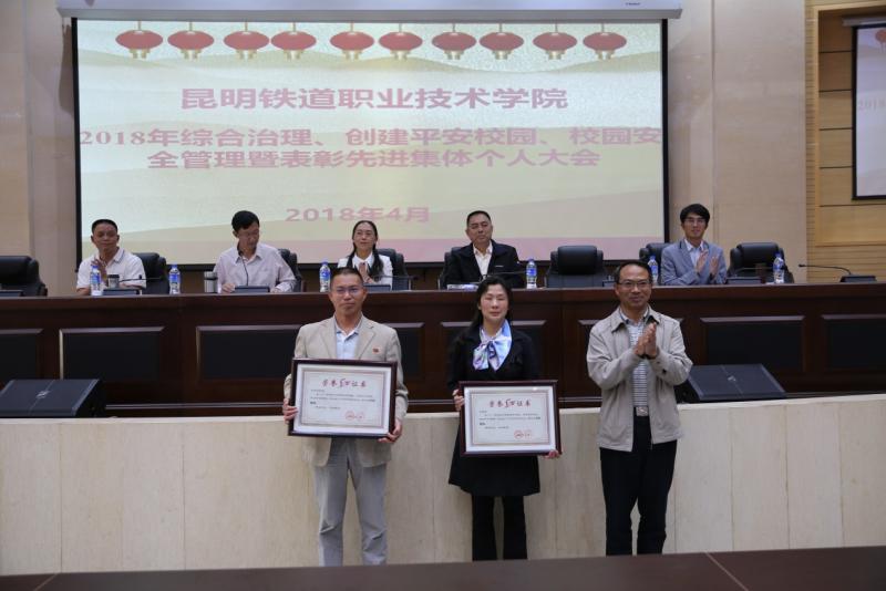 昆明铁道职业技术学院2018年度综合治理、创建平安校园表彰大会首先进行。学院综合治理委员会副主任、副院长谢文同志从压实责任,全面落实“一岗双责”主体责任;齐抓共管,全面筑牢平安校园防线;完善预案,促使演练活动更接近实战;抓值班管理,打造快速处置突发事件队伍四个方面对学院2017年综合治理工作作了系统总结。王树华校长宣读了表彰决定。院、校领导为荣获2017年综合治理先进的学生处,院办公室两个先进集体;计财处、铁道运输系两个表扬集体;赵伟、刘明云等29个先进个人颁奖。李瑞林院长与谢文副院长签订综合治理责任书,谢文副院长与中层干部代表教务处处长段渝波签订综合治理责任书。