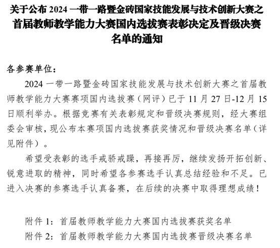 近日,2024一带一路暨金砖国家技能发展与技术创新大赛之首届教师教学能力大赛国内选拔赛结果新鲜出炉。我院参赛教师团队与来自全国近130支队伍角逐,三支团队凭借出色表现,荣获首届教师教学能力大赛三项荣誉。
