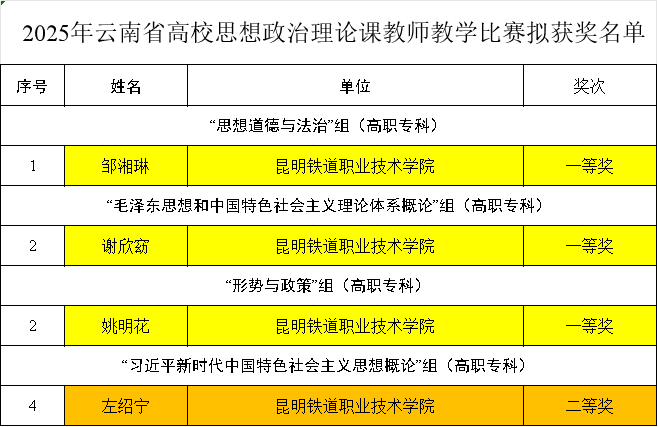 邹湘琳老师荣获《思想道德与法治》高职专科组?一等奖第一名,将代表云南省参加2025年粤桂琼赣滇五?。ㄇ└咝K枷胝卫砺劭吻嗄杲淌萄Щ竟Ρ热?。谢欣窈老师荣获《毛泽东思想和中国特色社会主义理论体系概论》高职专科组一等奖。姚明花老师荣获《形势与政策》高职专科组一等奖。左绍宁老师荣获《习近平新时代中国特色社会主义思想概论》高职专科组二等奖。