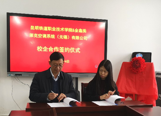 近日,昆明铁道职业技术学院与金鑫美莱克(无锡)空调系统有限公司成功举行校企合作协议签约暨培训基地揭牌仪式。学院党委委员、副院长尹光代表学院与金鑫美莱克公司人力资源总监华佳共同签署合作协议并进行揭牌。