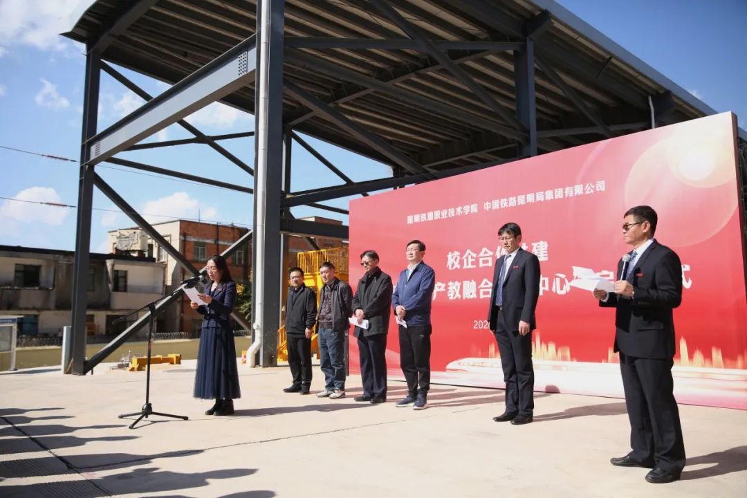 赵俊在讲话中表示,高素质的技术技能人才是支撑铁路和昆明局集团公司高质量发展的重要基础。我们积极寻求与高校合作,共同探索高素质技术技能人才培养的新途径、新方法。与昆明铁道职业技术学院合作共建“轨道交通产教融合实践中心”,就是要以“产教融合、协同育人示范基地”为共同目标,依托学院现有的轨道交通实训设备设施,打造“校企联合、双元育人”的技能人才培养平台,满足铁路行业车务、机务、车辆、工务、供电、电务、房建等系统技能人才培训需求,形成产教学研、人才深度培养的校企合作新机制,促进职业教育产教融合赋能提升,通过校企协同育人助力昆明铁道职业技术学院培养出更多优秀的轨道交通技术技能人才。