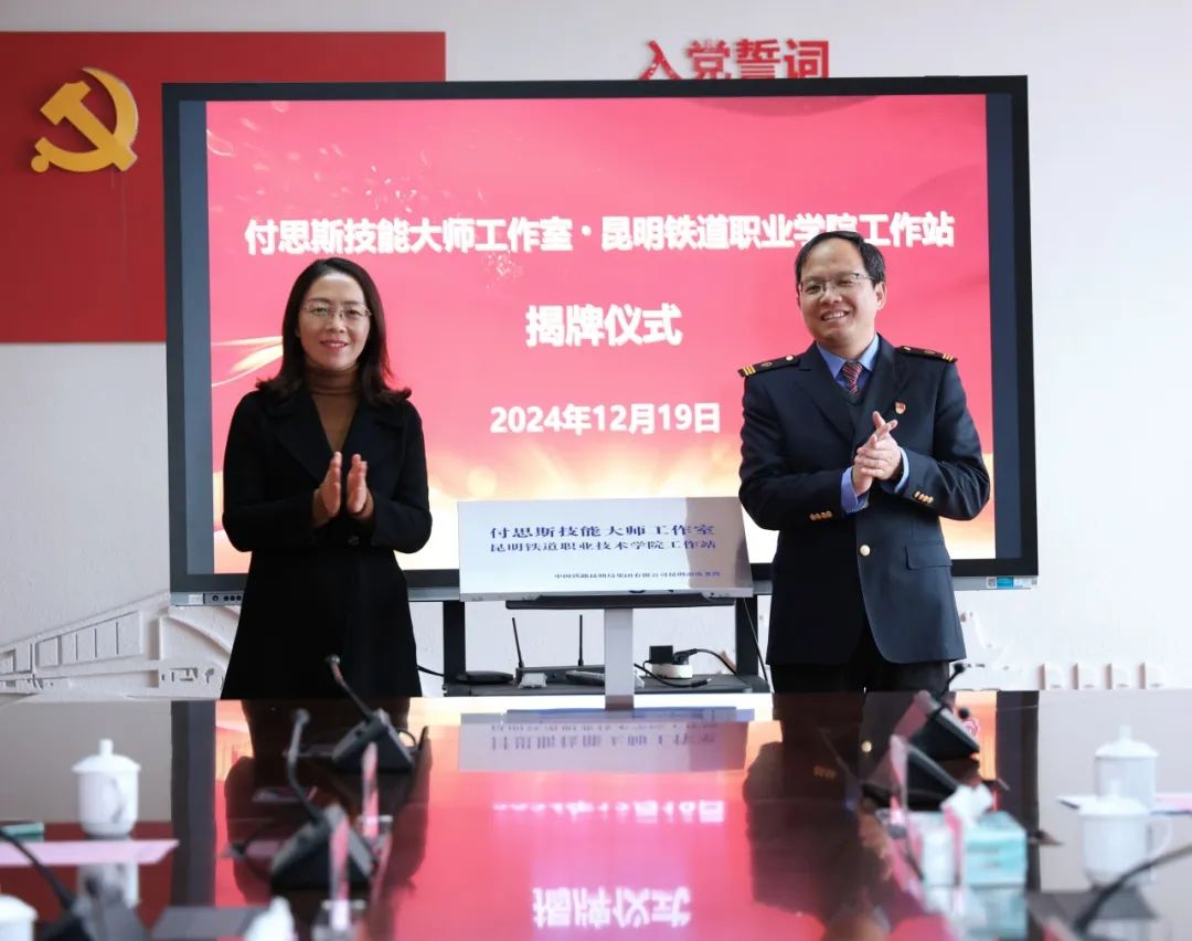 12月19日,“付思斯技能大师工作室?昆明铁道职业技术学院工作站”揭牌仪式在我校举行,学院党委副书记、院长李瑞林与昆明南电务段段长胡恩荣共同为工作站揭牌。昆明南电务段副段长王绕昌,云岭首席技师工作室主持人付思斯、昆明南电务段劳人科及职教科负责人,我校电气工程学院党政负责人及相关教研室人员参加揭牌仪式。