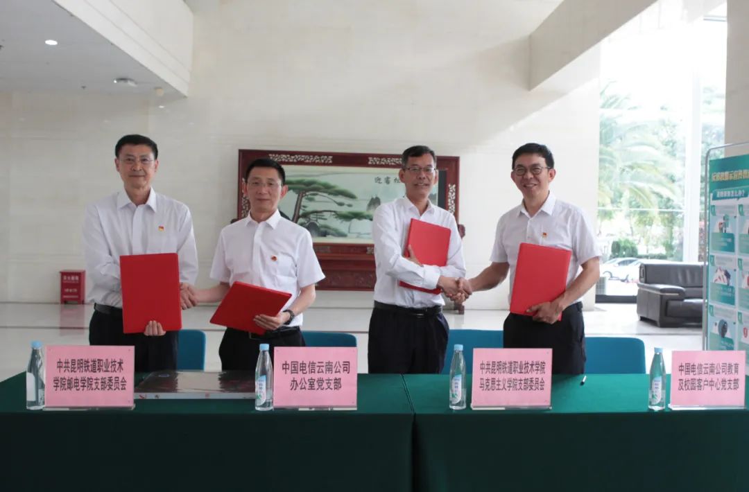 为深化合作内涵,强化党建引领,仪式上举行了党支部结对共建活动。邮电学院党支部、马克思主义学院党支部分别与中国电信云南公司办公室支部、校园中心支部签署了结对共建协议书。田效军代表学院向中国电信云南公司授“思想政治理论课实践教学基地”牌,标志着双方在拓展育人平台、深化实践教学方面迈出重要一步。