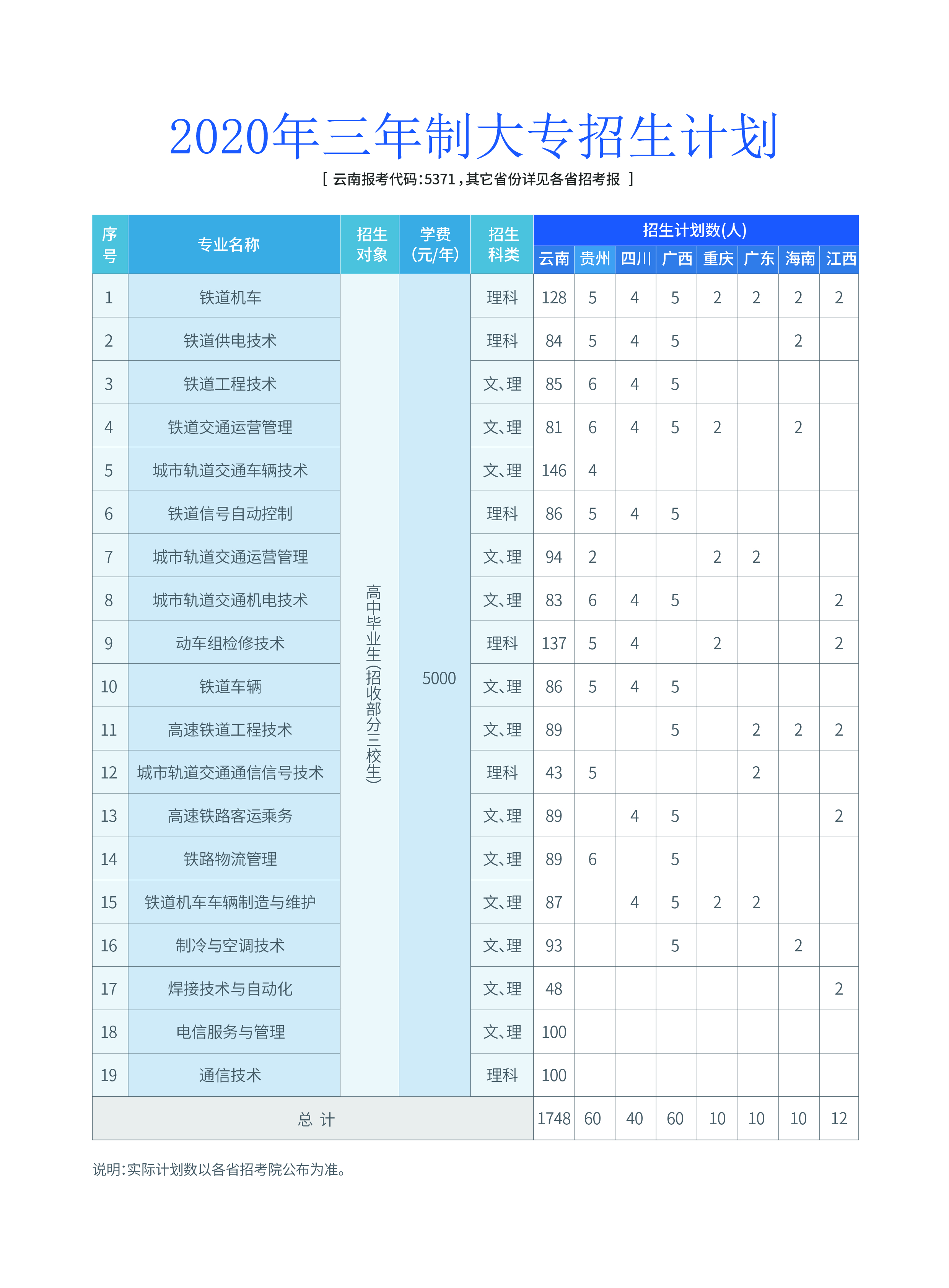 昆明铁道职业技术学院2020年招生计划及报考须知