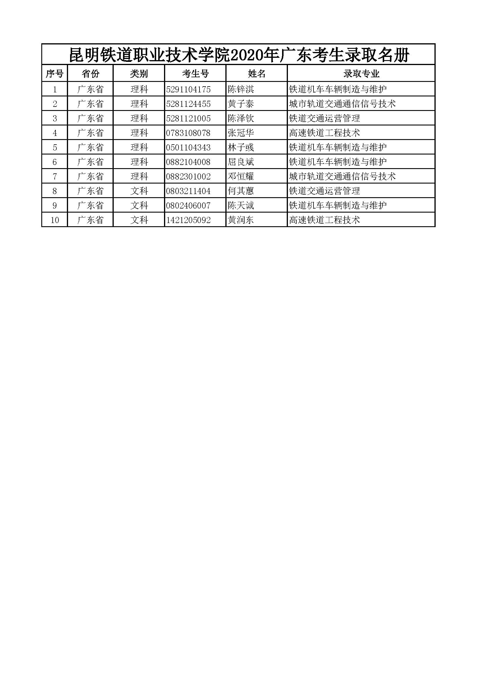 昆明铁道职业技术学院2020年广东考生录取名册