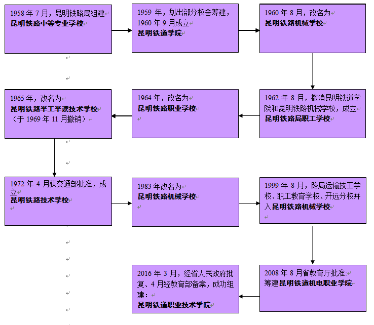 昆明铁道职业技术学院,源于云南省铁路修建通车运营而萌生,始建于1958年,随社会政治经济变革和铁路建设而成长。学院经过六十年的艰辛拼搏,砥砺奋进,教育质量不断攀升,办学实力稳步增强,社会影响日益提高,发展成为云南省唯一、西南地区办学历史悠久、资深权威的一所专门培养铁道类和轨道交通类技术技能人才的职业院校,积极为铁路和轨道交通行业培养了一批批优秀的技能人才。昆明铁道职业技术学院从诞生到壮大, 是几代园丁在昆明东郊凤凰山麓宝象河畔辛勤耕耘的丰硕成果,是园丁们艰苦努力铸造的职教丰碑,它铭记着数以万计学子孜孜不倦、追求智慧与技能的史实,见证着云南铁路、轨道交通的建设、发展与辉煌。