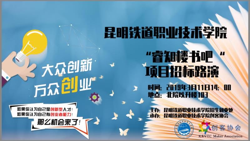 为响应国家“大众创业,万众创新”的号召,推进昆明铁道职业技术学院创新创业教育改革,深化人才培养模式,增强学生的创新意识和锻炼学生的创业能力,2019年3月12日下午,由学院招生就业处筹办的“睿知楼书吧”项目招标在北院以升楼103室圆满举行。