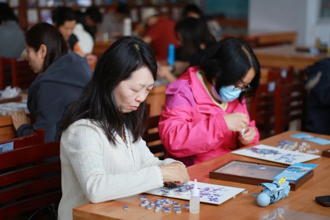 随后,创意手工环节正式展开。老师和同学们纷纷化身“生活艺术家”,面对琳琅满目的青花瓷碎片,她们巧思构图、细心拼贴。经过大家的精心制作,一幅幅独具匠心的青花瓷相框画作品逐一呈现。大家手捧作品合影留念,定格下这美好的瞬间。