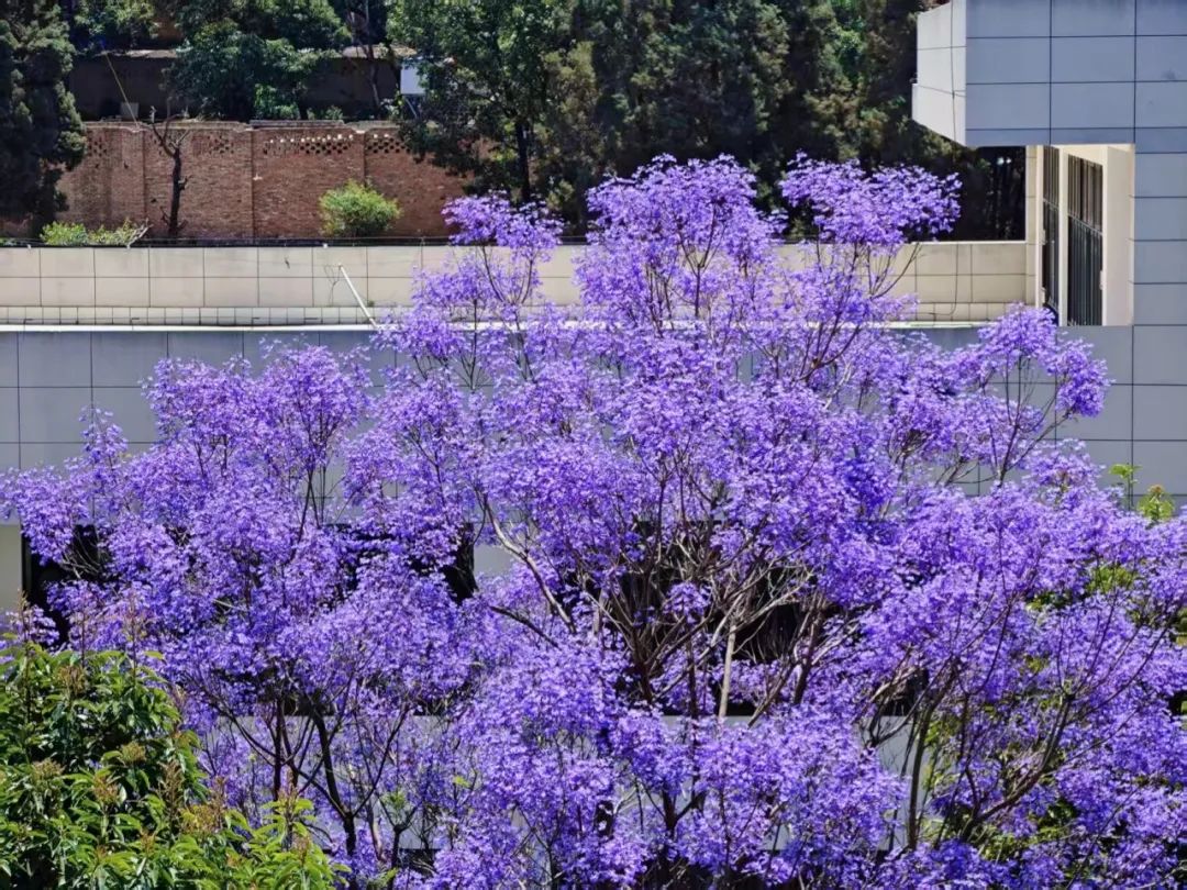 五月的风掠过教学楼顶,千万片蓝紫色花瓣正簌簌坠落。当食堂外的玻璃幕墙映出摇曳的花影,当宿舍楼后面的小路被染成梦幻的淡紫色,校园里最温柔的季节悄然来临——这是专属于蓝花楹的美好时光。