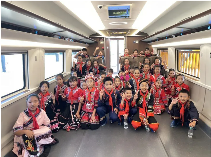 昆明铁道职业技术学院学生走进宁洱民族团结实验小学,为宁洱民族团结实验小学师生代表讲述了从滇越铁路到中老铁路的云南铁路发展史,以及铁路沿线各民族在交往交流交融中和谐共生、精诚团结、人心归聚、精神相依的历史故事。大学生牵手小学生,在一张张白纸上,大家用画笔画出了自己心目中的高铁模样。