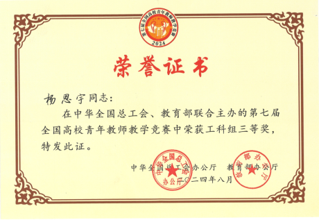 8月28日至29日,第七届全国高校青年教师教学竞赛在上海交通大学举行。我校机车车辆学院教师杨恩宇作为第一届云南省高校青年教师教学竞赛工科组特等奖选手,代表云南省参加国赛,经过激烈角逐,荣获第七届全国高校青年教师教学竞赛工科组三等奖。