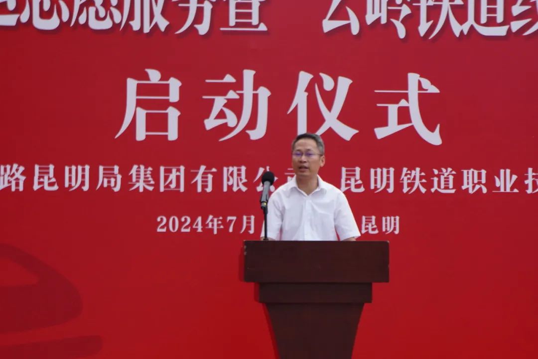 集团公司客运部副主任石良致辞。他提到,近年来,学院分批组织大学生参加铁路春暑运,在集团公司广大干部职工的辛勤努力和学校有力补充、大力支持下,高质量完成了春暑运工作,满足了人民群众日益增长的美好出行生活需求。他表示,2024年暑运是校企共建“云岭铁道线上大思政课”的首个暑运,要全力打好打赢暑期运输攻坚战。希望同学们珍惜机会、积极作为,虚心学习、用心服务,安全第一、确保顺利。他要求各单位和学校加强沟通、强化管理。