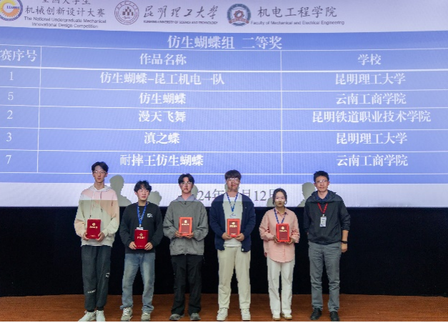 由王廷轩、方健康两位老师指导,艾靖杰、沈良儒、施吉、孟繁晨、曹宁超五位同学组成的“漫天飞舞”团队获得仿生蝴蝶组云南省赛二等奖。
