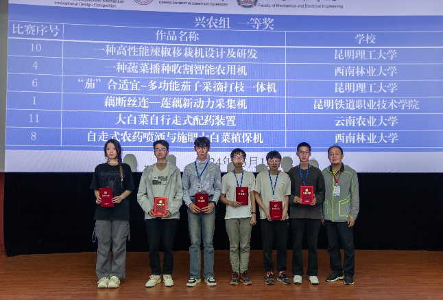 由王廷轩、方健康两位老师指导,王太、李昱琨、欧阳素梅、赵世粲四位同学组成的“藕断丝连——莲藕新动力采集机”团队获得兴农机械组云南省赛一等奖(云南省唯一高职院校)。
