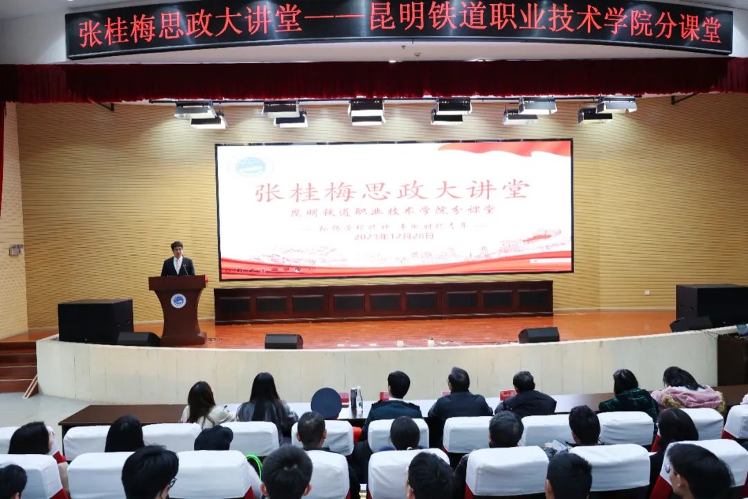 12月28日,学院以“弘扬劳模精神 争做时代青年”为主题,举行张桂梅思政大讲堂昆明铁道职业技术学院分课堂,邀请我校优秀校友钟照阳、刘伟到校,结合自身成长及工作经历进行分享。学院班子成员、各党支部书记、相关部门负责人、马克思主义学院教师及500余名学生代表参加此次分课堂。