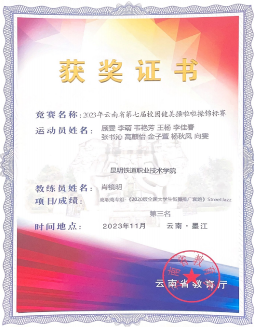 2023年12月,大学生艺术团舞蹈队参加2023年云南省青少年街舞锦标赛中,获大学组体育道德风尚奖。
