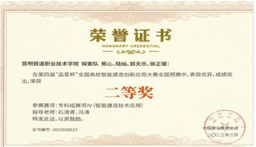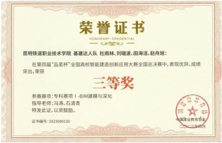 2023年3月,BIM协会在第四届“品茗杯”全国高校智能建造创新应用大赛·专科组赛项IV(智能建造技术应用)中,获二等奖;专科赛项I-BIM建模与深化中,获三等奖。