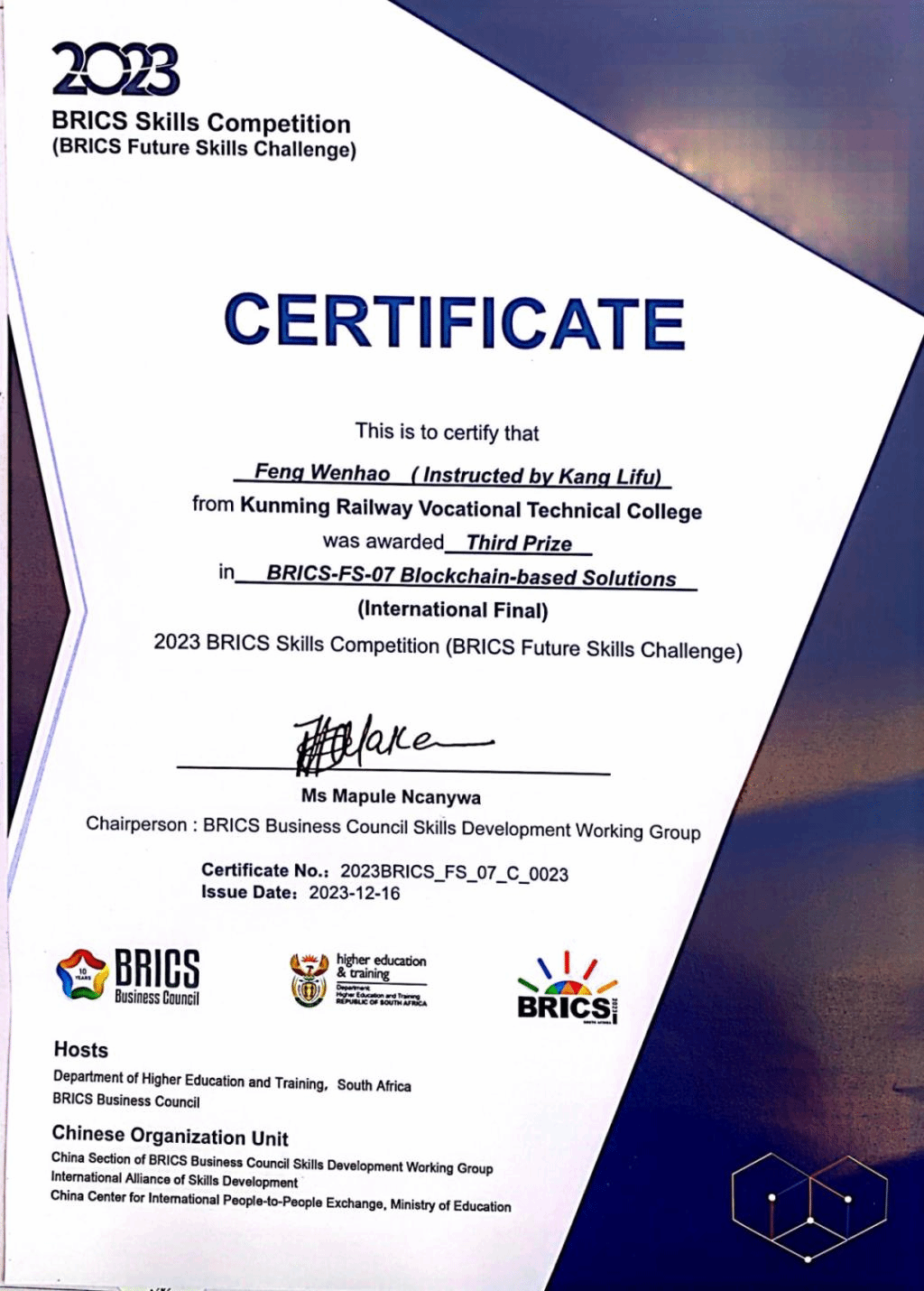 【喜讯】我校学子在2023金砖国家职业技能大赛中国分赛区区块链赛项国际总决赛中荣获三等奖