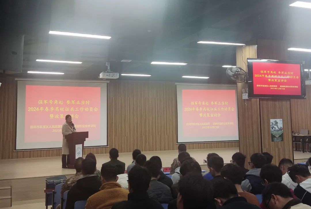 为增强国防意识、厚植爱国情怀,让广大适龄青年了解应征入伍相关政策,营造人人关心国防、积极参与国防建设的氛围。12月13日,官渡区人民武装部到我校开展“征兵宣传进高?!被疃?,宣传国家征兵政策,鼓励青年大学生携笔从戎,投身军营。