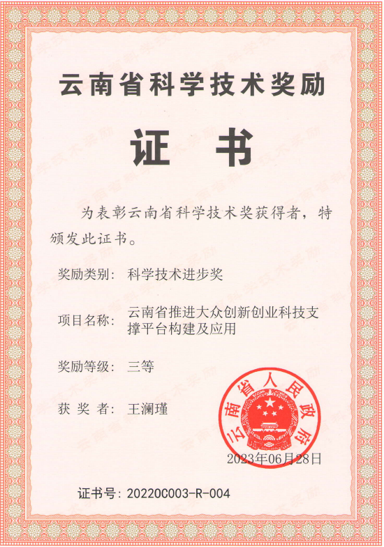 近日,云南省人民政府发布《关于2022年度科学技术奖励的决定》,对在云南省科学技术进步、经济社会发展中作出突出贡献的科学技术人员和组织给予奖励。由我校王澜瑾老师作为主要研究成员、学院作为第二完成单位完成的《云南省推进大众创新创业科技支撑平台构建及应用》项目荣获云南省技术进步奖三等奖,为本次获奖单位中唯一一所职业院校,这也是我校首次在科学技术领域获得的省级奖励。