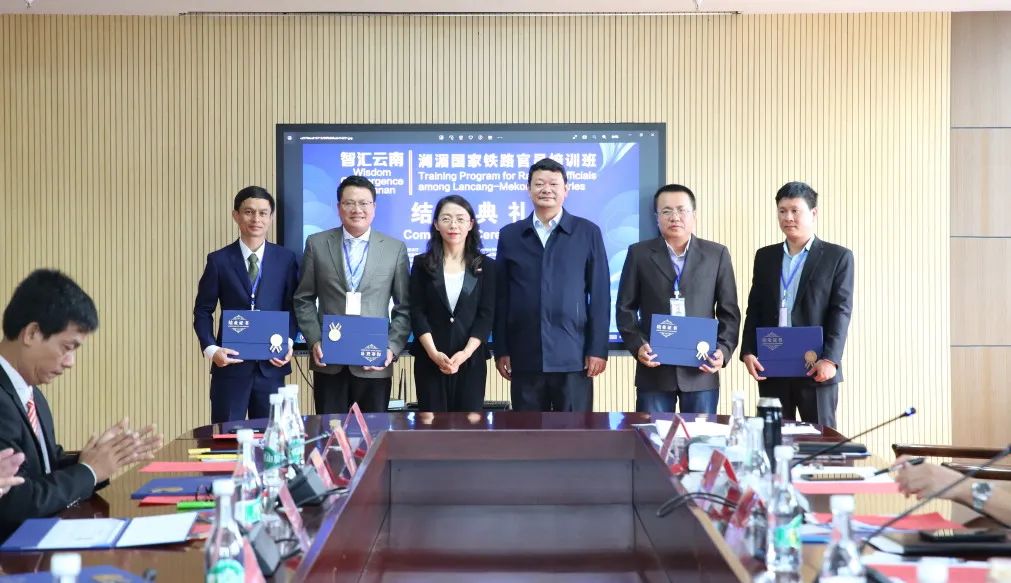 李瑞林院长、王学光主任向学员颁发毕业证书,活动在欢乐与不舍的气氛中结束。由云南省科技厅支持,云南中华职业教育社、昆明铁道职业技术学院联合举办的“智汇云南”计划澜湄国家铁路官员培训班至此圆满收官。