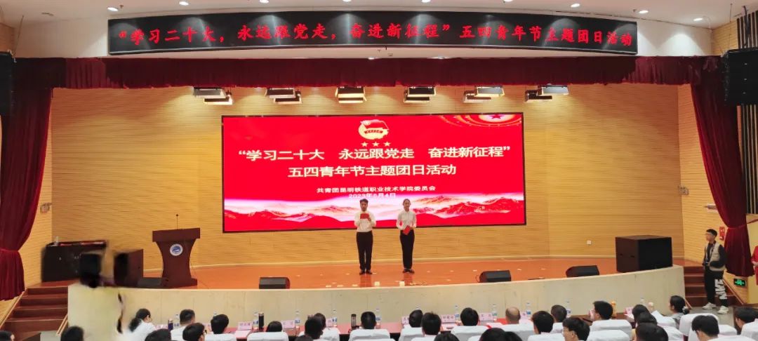 团委副书记陈冠翱宣读《全国铁道团委关于表扬第二十二届“ 铁路青年五四奖章”和2022年度全国铁路五四红旗团委( 团支部) 、全国铁路优秀共青团员、全国铁路优秀共青团干部的决定》《共青团昆明市委关于2022年度“昆明五四红旗团委”“昆明五四红旗团支部”“昆明优秀共青团干部”“昆明优秀共青团员”选树情况的通报》《共青团昆明铁道职业技术学院委员会2022—2023年度“五四”表扬的决定》。