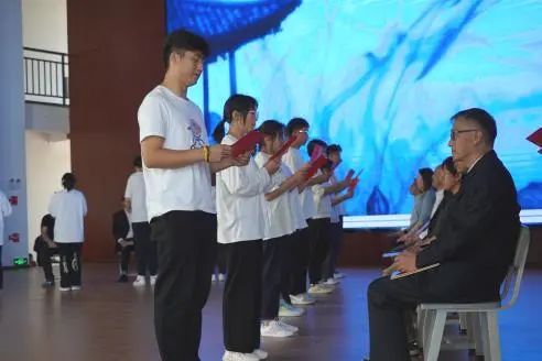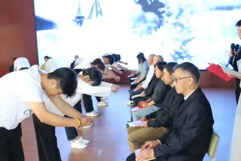 拜师仪式上,学生郑重的向师傅鞠躬、呈贴、敬茶,师傅对弟子提出殷切希望。